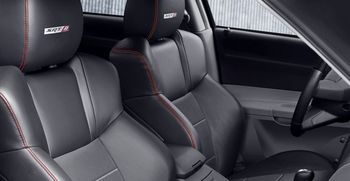 The fabric-covered seats that come standard are comfortable, with adequate thigh support and side bolstering. Stepping up to the performance seats in the option packages gets more pronounced bolsters, which is good for those rare times when a twisty two-lane beckons, but not as good for climbing in and out of the car every day. And, of course, the top grade, suede-trimmed and embroidered seats in the Daytona nicely complement the boy-racer graphics of the exterior. Thanks to the sedan-spec wheelbase, there's plenty of rear seat room, too, even with front seats at their rearmost positions. No head restraint for the rear center seat is provided, however, making this car better for four adults than five.