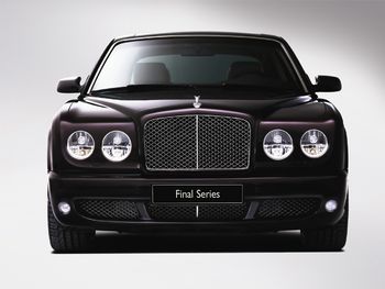 • At the 2008 Paris Motor Show, Bentley unveiled the Bentley Arnage Final Series. As the name implies, the Arnage line is about to end to make way for a new flagship Bentley in 2010. Only 150 of the Final Series Arnages will be produced all based on the Arnage T and motivated by the monumental 500 hp, 738 lb-ft torque 6.75 litre V8. However, the interior will be more like the Arnage R and be chock full of toys ...err Essential Executive Equipment such as a rear cocktail cabinet with a Final Series stainless steel flask, two shot glasses, four Bentley umbrellas and Final Series badges. The car will also be significant as the storied marque will be celebrating their 50 year Jubilee Anniversary this year. [1]